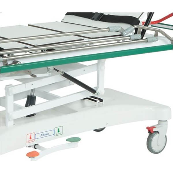 Posições: Fowler, semi-fowler (dorso de 0° a 90°) e pernas, Trendelenburg e Reverso do Trendelenburg acionados manualmente por mola a gás. Movimento de elevação de altura através de uma coluna com sistema hidráulico a pedal.